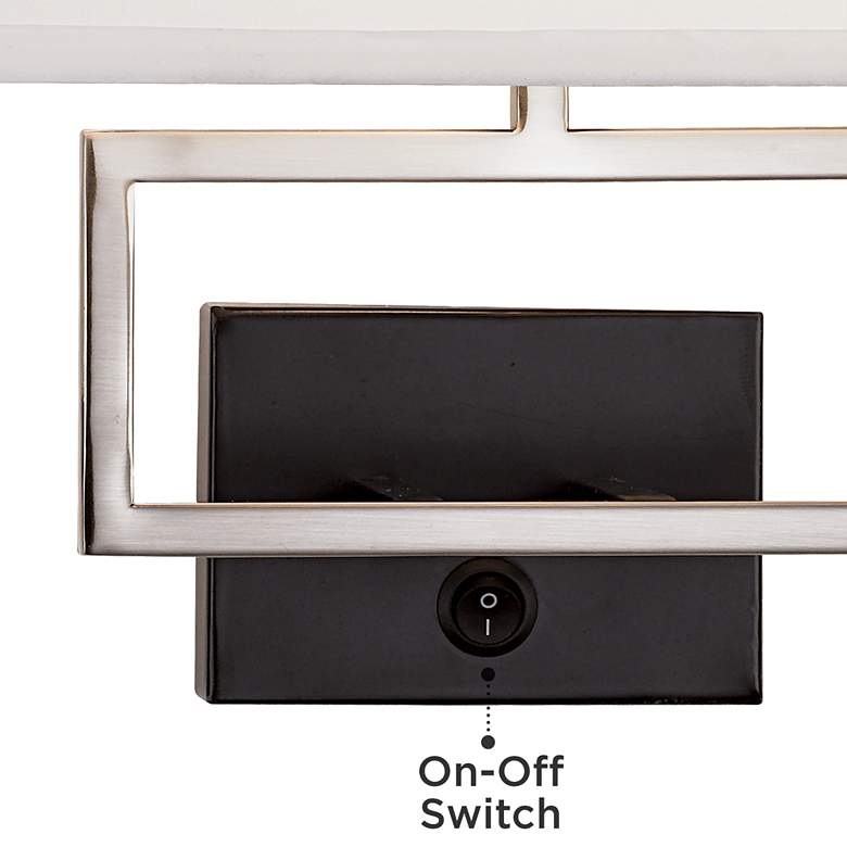 Perfectly easy to use, these modern plug-in wall lamps set of two feature an on/off switch on the backplate. From the Possini Euro Design brand, each design installs easily - just attach it to the wall, then plug into any standard wall outlet. It features a modern brushed nickel finish open frame and matte black finish backplate. Up top is a white cotton and poly-blend fabric shade that offers a final pop of style.