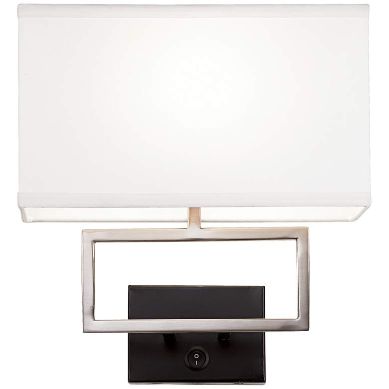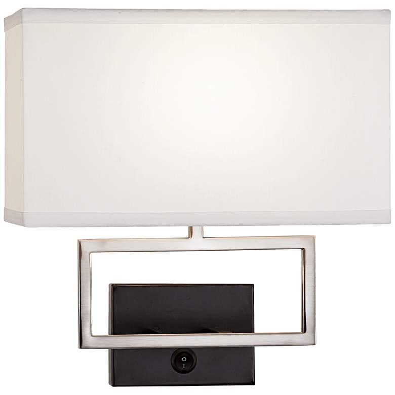 - Brushed nickel finish over rectangular open metal frame. Matte black finish backplate. Cotton-poly blend fabric shade Easy installation - no electrician is needed.