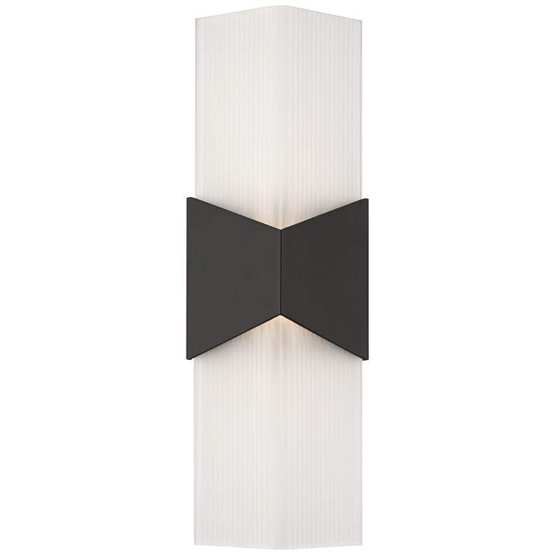 Dress up your home in class with the set of two Tux outdoor wall lights from the Possini Euro Design® brand. This modern minimalist design is ready for a night out on the town with a black finish aluminum construction, shaped in a classic bowtie style, against a semi-opaque white ribbed glass shade as the dress shirt. Wet location rated, this design is perfectly suited for outdoor use, and can be mounted both vertically or horizontally.