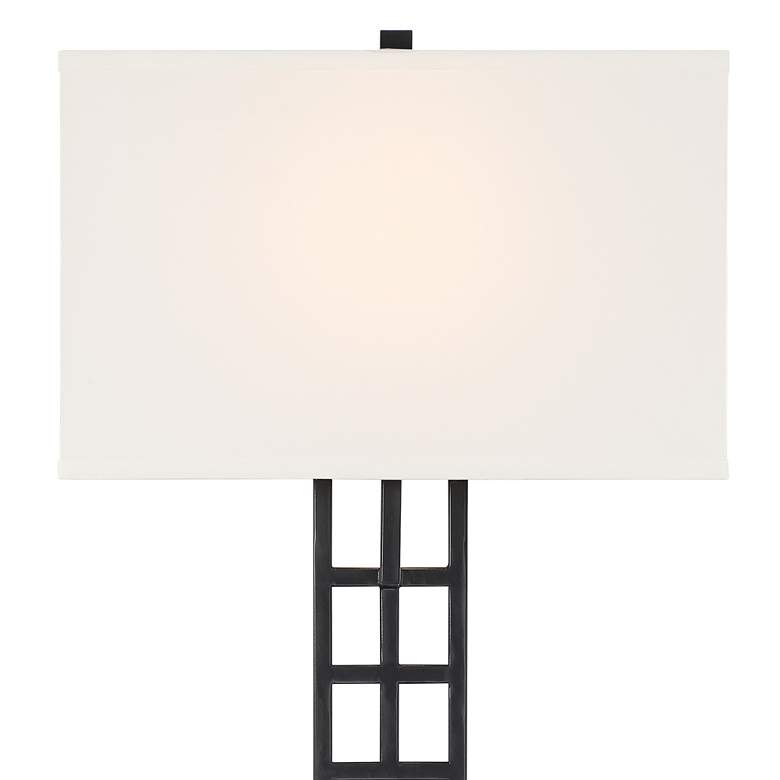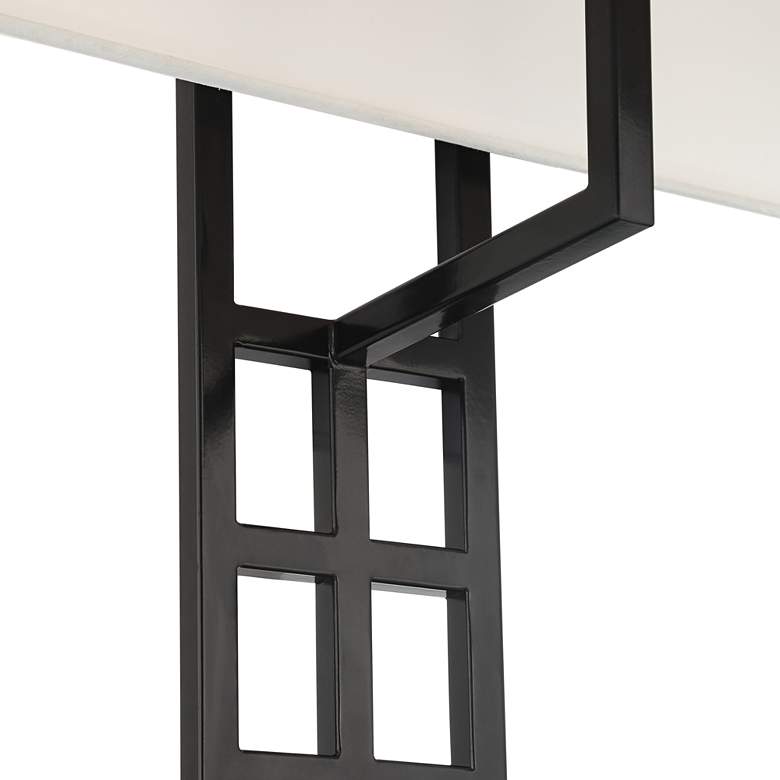 - Matte black finish, metal construction. White linen fabric box shade. 8-foot long clear silver cords.