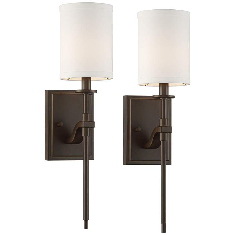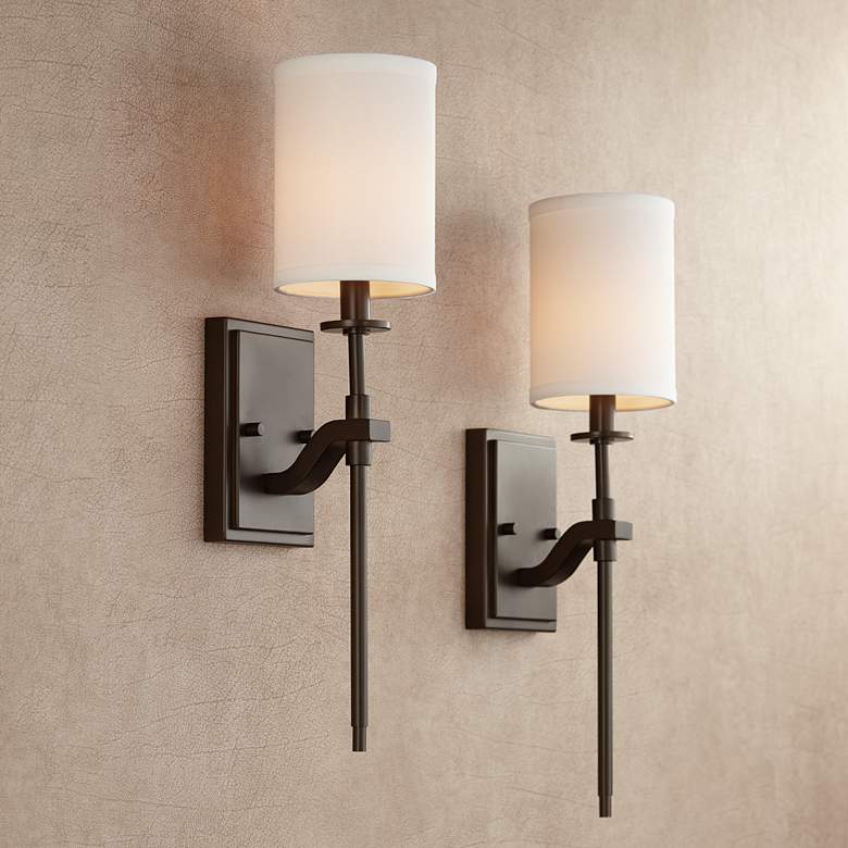From the Walton collection by Possini Euro Design, these contemporary wall sconce fixtures comes in an oil-rubbed bronze finish frame. An elegant off-white linen cylinder shade is balanced on top. Perfect for hallways, bathrooms, bedrooms, and more.