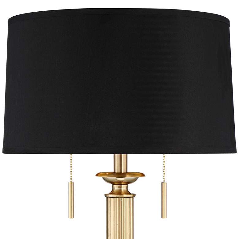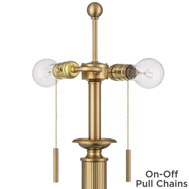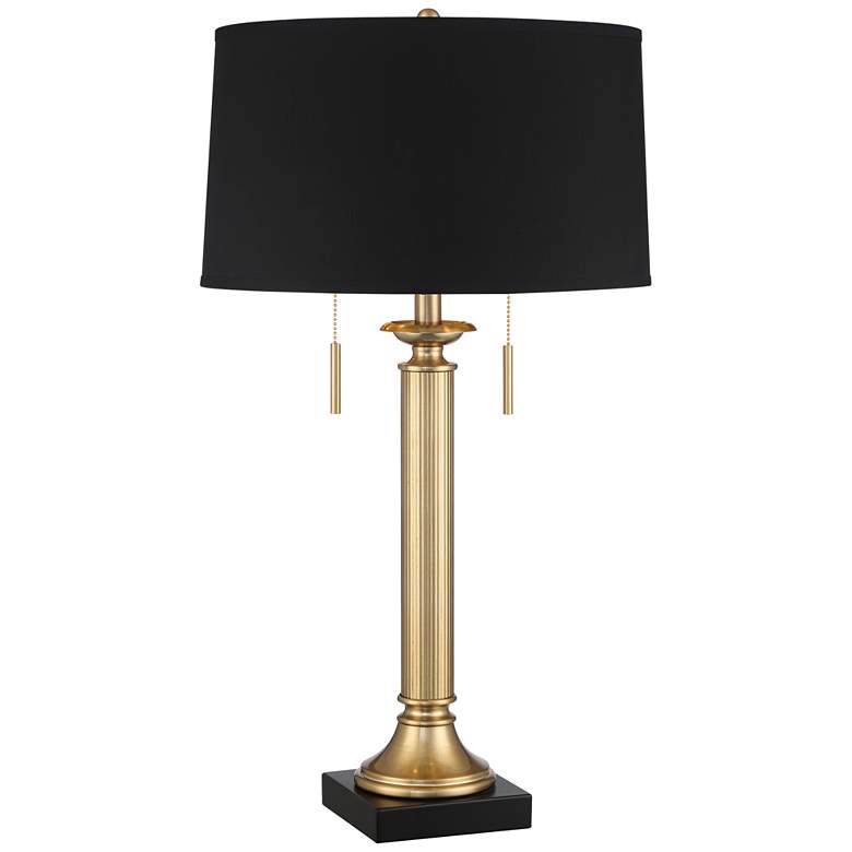Add traditional style to a study or work desk with this handsome desk lamp design from the Possini Euro brand. The lamp features a warm gold finish with a black base and a designer shade with gold lining. Handy twin pull chains allow you to easily set the lighting level in a room. A built-in dual USB port in the base allows you to charge smart phones and other electronic devices.