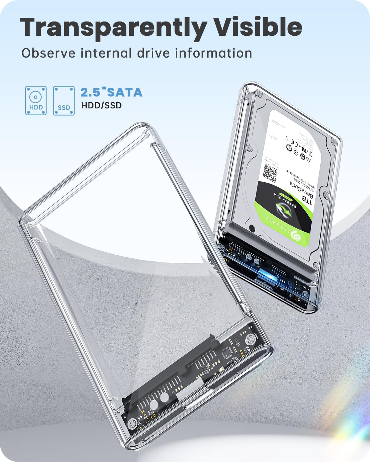 - Transparent Anti Drop Design: Clear hdd/ssd enclosure allows direct view of internal hard drive,high quality PC + ABS material shell effective anti drop and anti shock, in addition to the built in EVA sponge can ensure that the hard drive and the SATA interface stable connection.