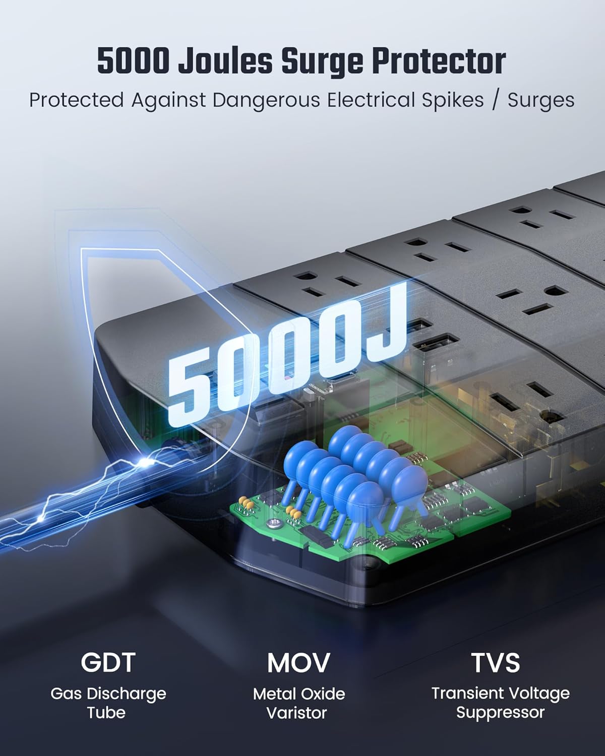 - 5000 Joule Surge Protector: With industrial-grade massive 5000 joules of surge protection, the built-in surge protector offers you peace of mind, safeguarding your valuable electronics from potential power surges and voltage fluctuations. The surge protector has LED indicators to let you know whether your devices are safe.