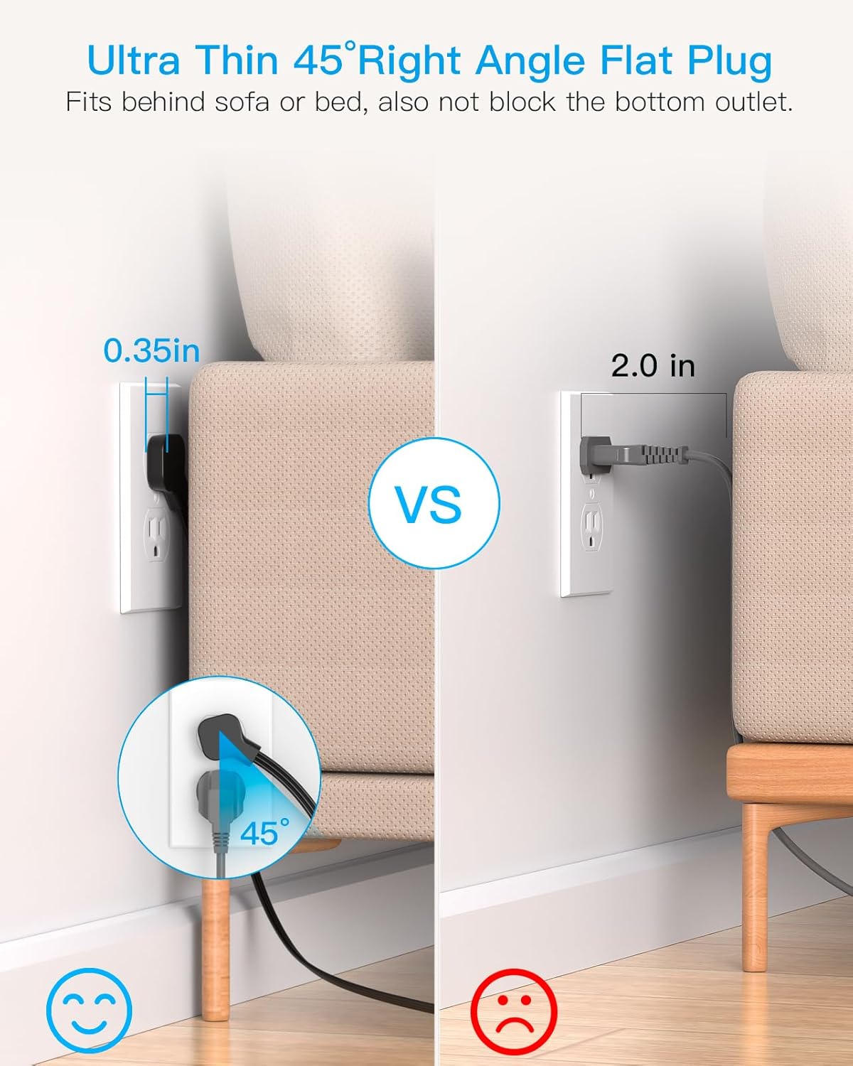 - 【Ultra Slim Flat Plug Power Strip】With only 0.35 inch ultra thin plug and 45° right angle design, which can close to the wall easily, and hide in the back of furniture, bed or refrigerator
