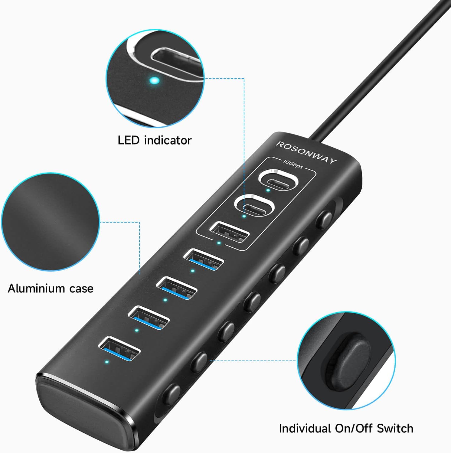 - Hybrid USB Port Expander: Rosonway 7 Ports USB Hub instantly adds 10Gbps USB-A 3.2 port, 2 USB-C 3.2 ports, and 4 USB-A 3.0 Ports extensions to your laptop, desktop, gaming host and more. Plug-and-play, no driver required, easy to solve the problem of insufficient ports, allowing you to connect multiple USB devices at the same time