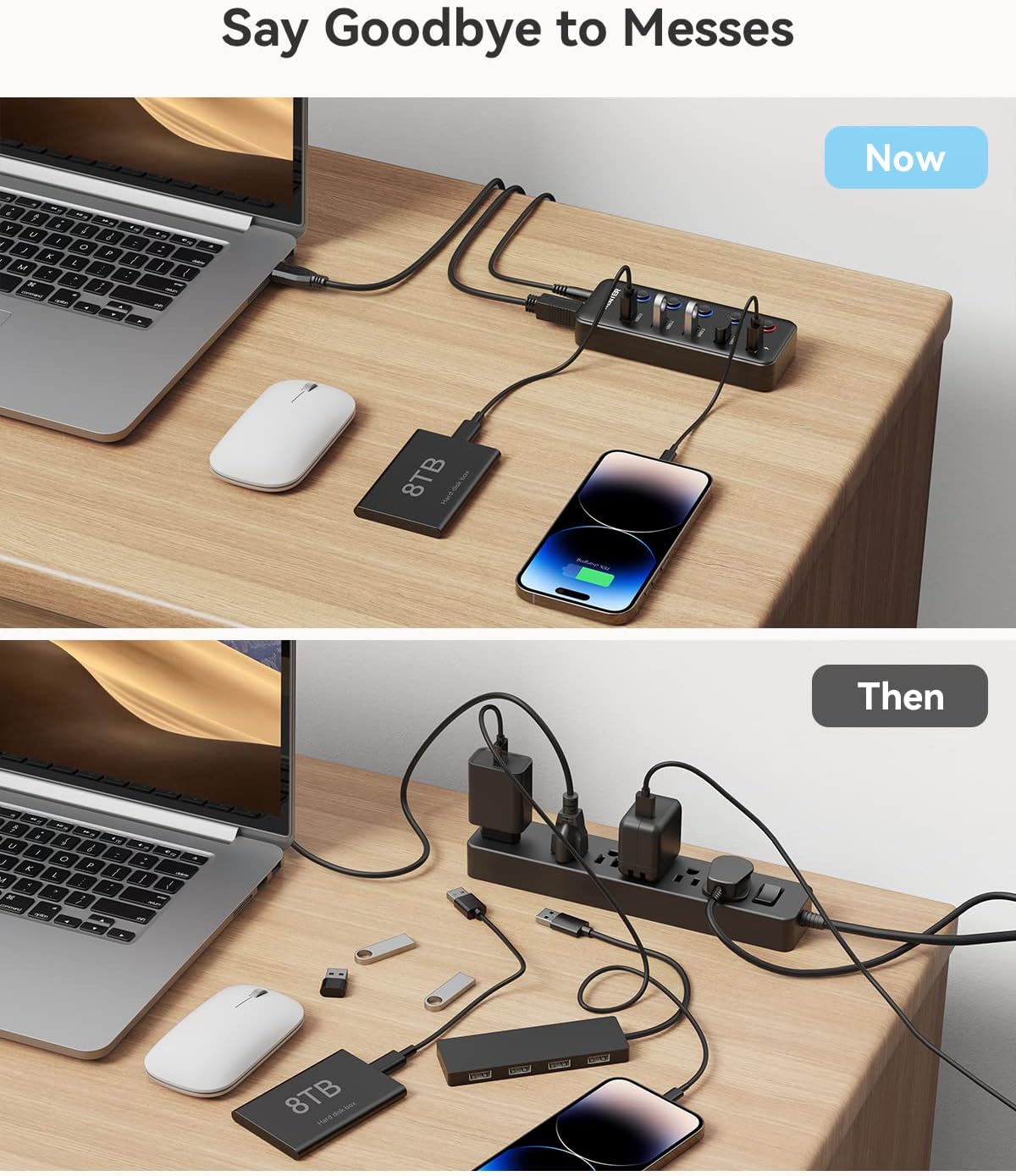 - Longer Cables for Flexible Arrangement: With a generous 100cm (3.3ft) USB cable and 120cm (4ft) power cable, our USB 3.0 hub provides the freedom to arrange your cables with ease. Elevate your USB experience with our exceptional USB 3.0 powered hub! Embrace seamless connectivity, rapid charging, and full control over your devices. Upgrade your USB setup today