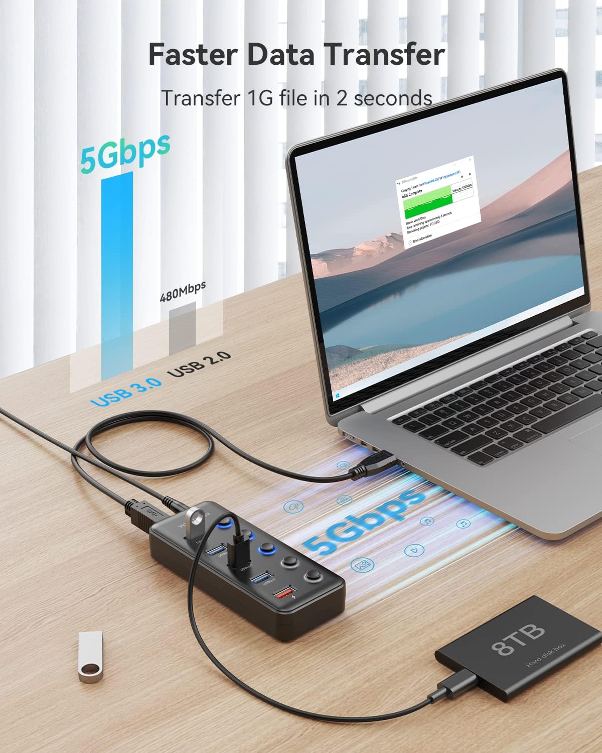 - Elevate Your USB Experience with Our Powered USB Hub 3.0: Instantly expand one USB port into four external USB 3.0 data ports, catering to your needs for keyboard, mouse, printer, hard drives, USB flash drives, and more. Experience lightning-fast data syncing at up to 5Gbps, saving you valuable time in transferring files