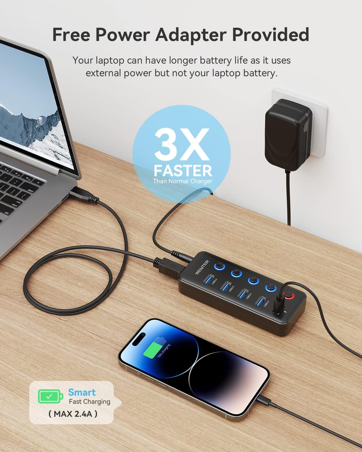 - Smart Charging Hub for All Your Devices: Our powered USB hub boasts an additional dedicated charging port, freeing you from the hassle of finding extra space to charge your tablets, cameras, phones, watches, and Bluetooth headsets. The 5V/3A power adapter delivers a blazing-fast charge of up to 2.4 amps for your devices