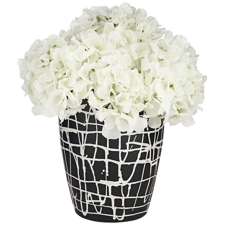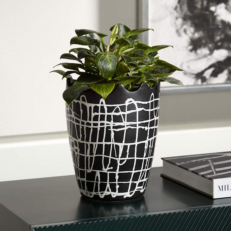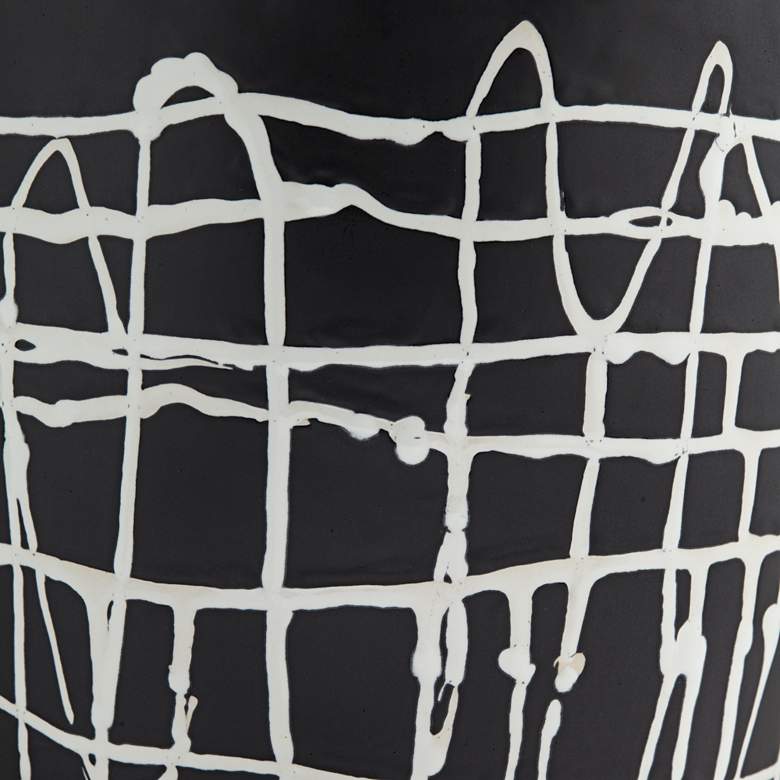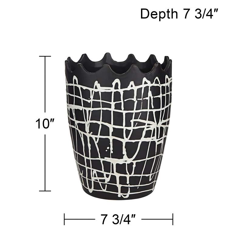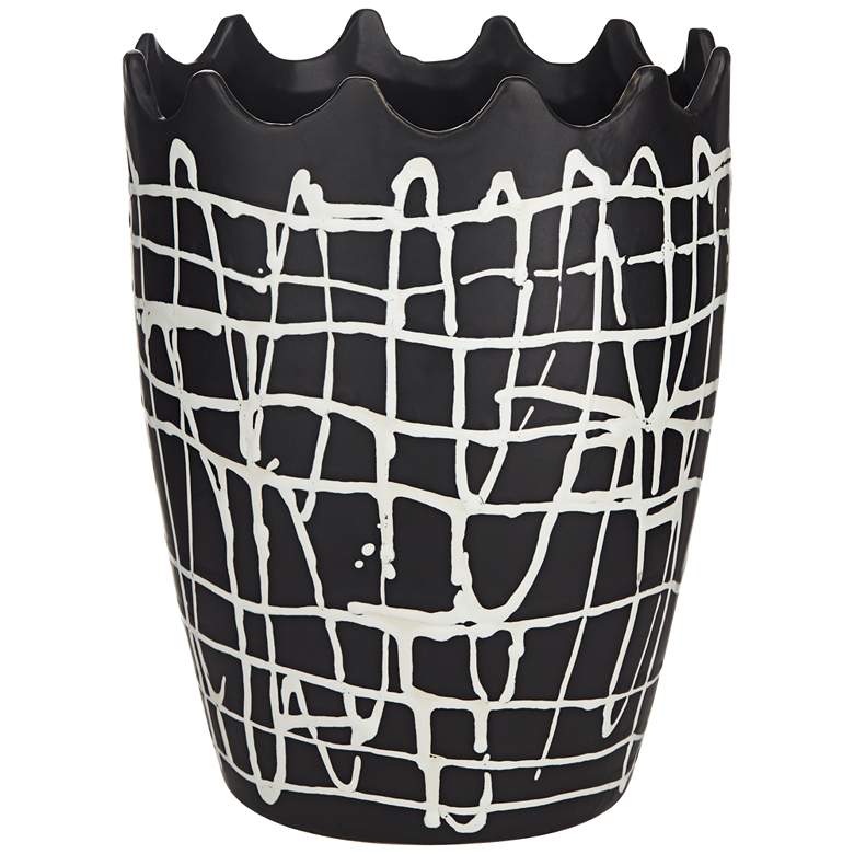 An exceptional display of artistry, this modern ceramic vase is a true centerpiece to any tablescape. From Studio 55D, it delivers a tall, tapering silhouette complete with a scalloped edging that adds dimension and drama. The ceramic construction features a black finish with abstract white lines that bring a hint of organic flair to this hand-painted design.