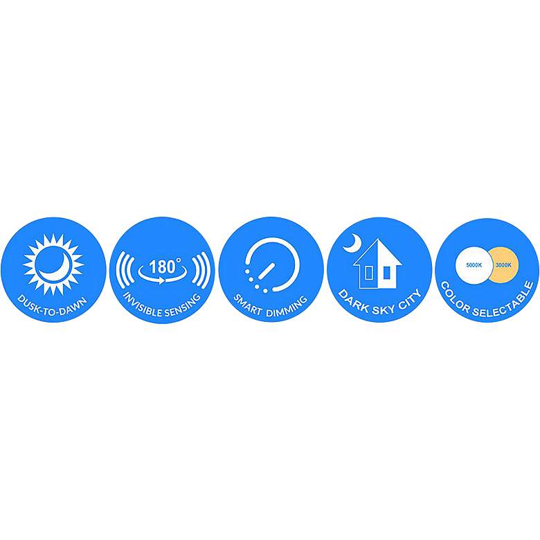 - "SMART ON" feature. 180-degree motion detection coverage. Auto dusk-to-dawn operation.