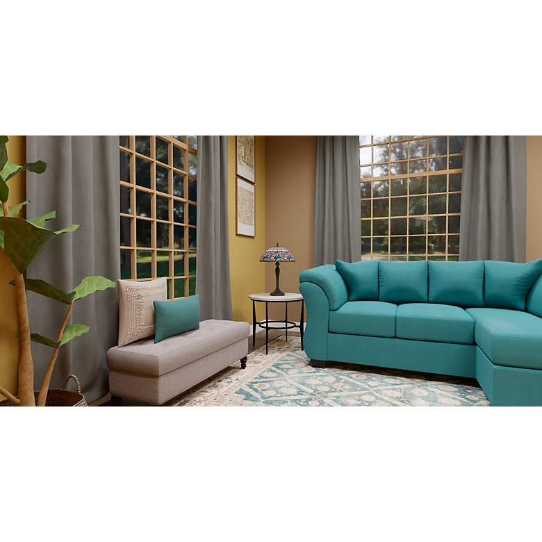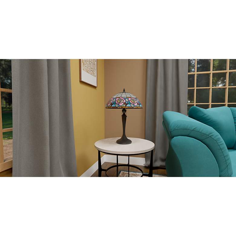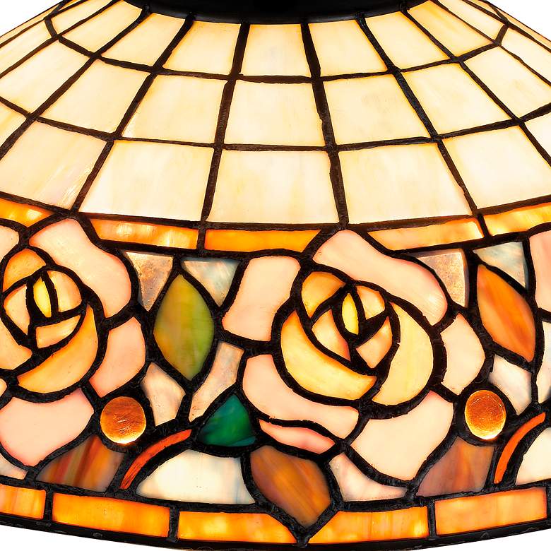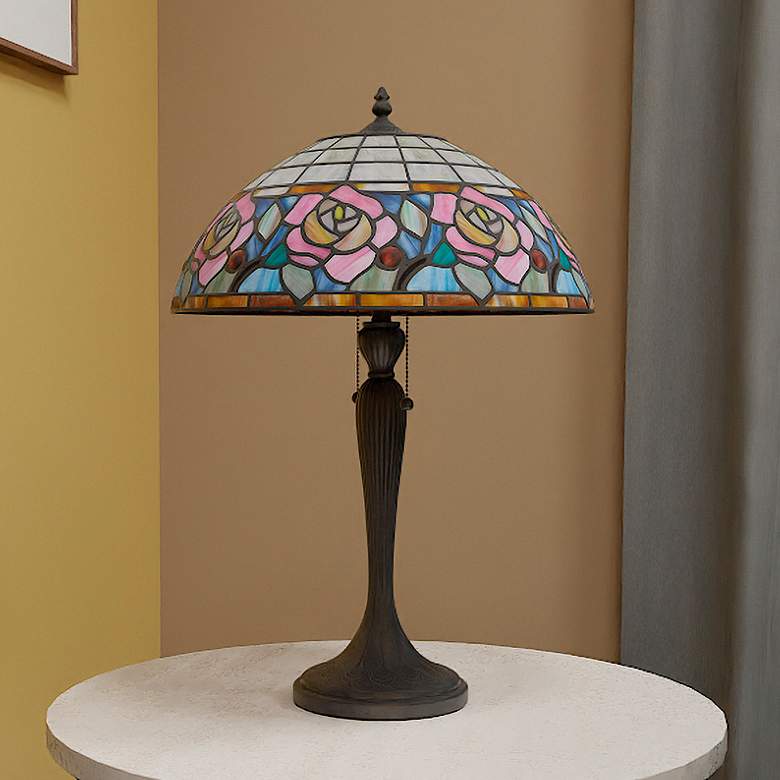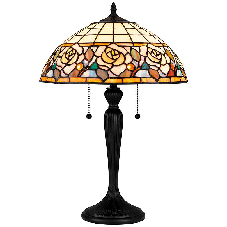 - Betty table lamp with a floral pattern art glass shade. Arts and Crafts, Tiffany-style lamp from the Quoizel Lighting brand.