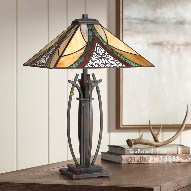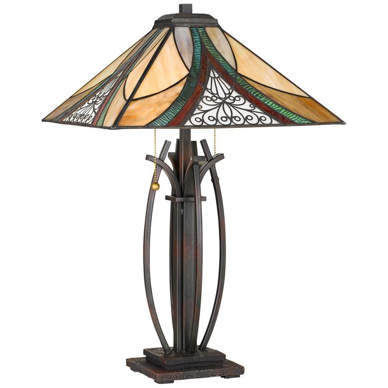 Designed by Quoizel, this two-light table lamp is a perfect choice for a living room side table or a credenza in a home office. The lamp features a beautiful, eye-catching Tiffany style cut glass shade with a wide square silhouette. The base of the lamp features a series of convex curves surrounding a center support, all in a wonderfully warm valiant bronze finish.
