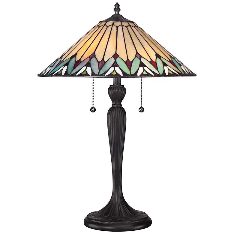 This slender and chic art glass table lamp makes a perfect Tiffany-style accent for almost any room. The round shade with soft opalescent tones and a contrasting bold floral trim has a visually-pleasing, softly scalloped edge. A stylized Espresso Bronze finish metal base enhances the authenticity of this iconic home accent. Two lights are controlled by dual pull chains. This elegant Quoizel lamp will warm your home with its enduring glow.