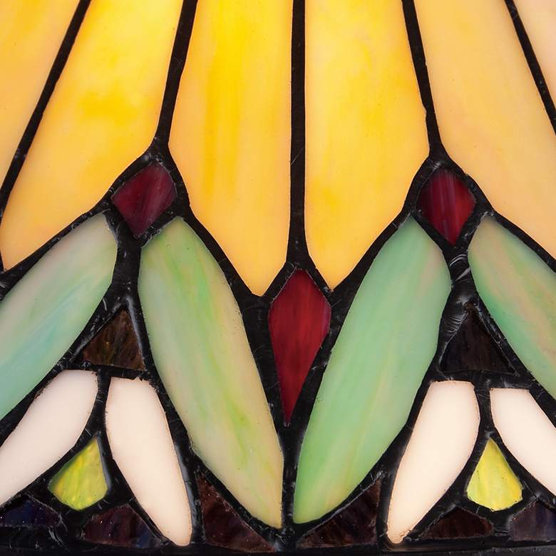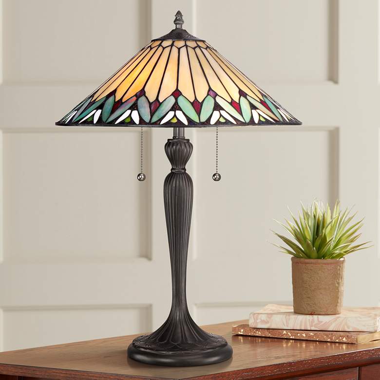 - Floral pattern Tiffany-style art glass table lamp with feather pattern decorative shade. From the Quoizel lighting brand.