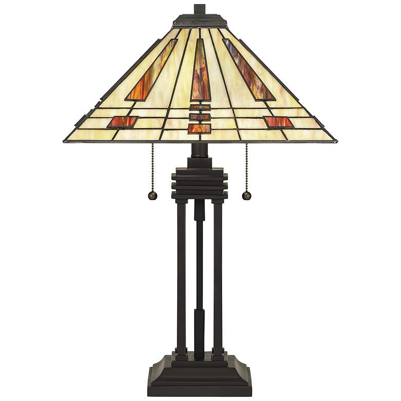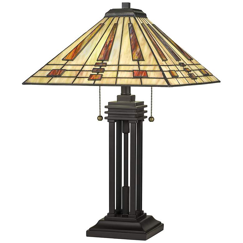 From Quoizel, this bronze table lamp offers a traditional Tiffany-style design for that perfect blend of vintage style and modern charm. The tapering art glass shade comes in shades of light yellow and reddish amber for a warm look. Two pull chains dangle down from the shade, each one controlling its own light socket. Perfect for living rooms, bedrooms, and more.