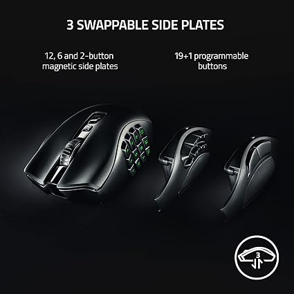 - ABSOLUTE ADAPTABILITY AND CONTROL — This mouse comes with a set of 12, 6 and 2-button magnetic side plates, allowing to adapt to any game genre with control of up to 19 plus 1 programmable, backlit buttons