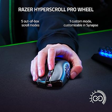 - RAZER HYPERSCROLL PRO WHEEL — With adjustable tactility, resistance, and steps, create firmer, more distinct scrolls for precise weapon switching, or softer, smoother scrolls with multiple steps to easily spam inputs like jump