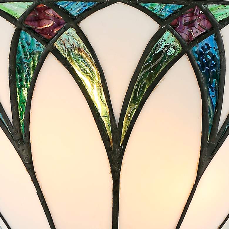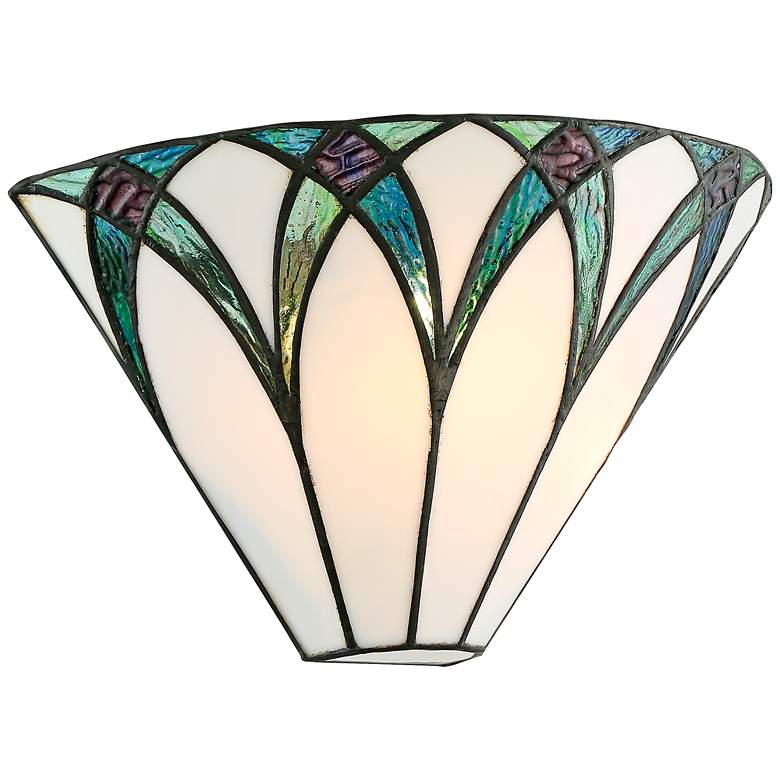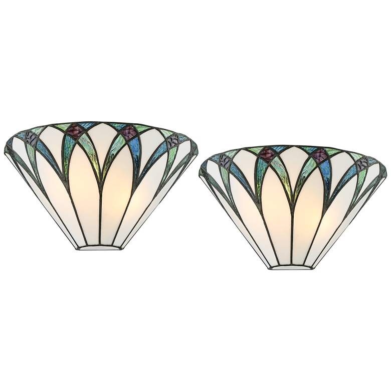 Inspired by classic Tiffany designs, this set of two wall sconces is a delightful design from Regency Hill. Art glass panels in neutral tones are complemented by blue glass pieces. Bronze finish hardware completes the traditional look. Use this light to create a stylish look for any hallway or living area.