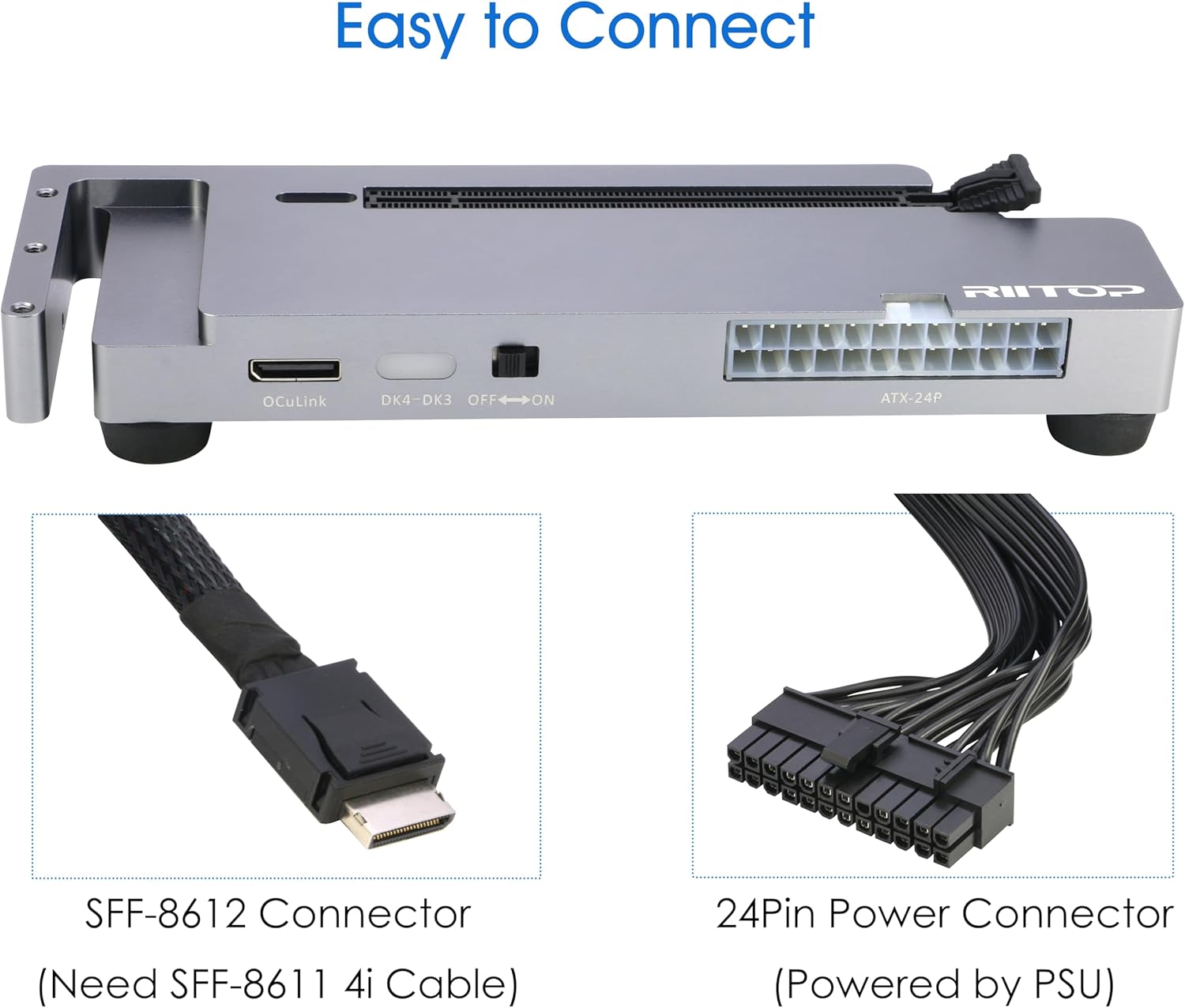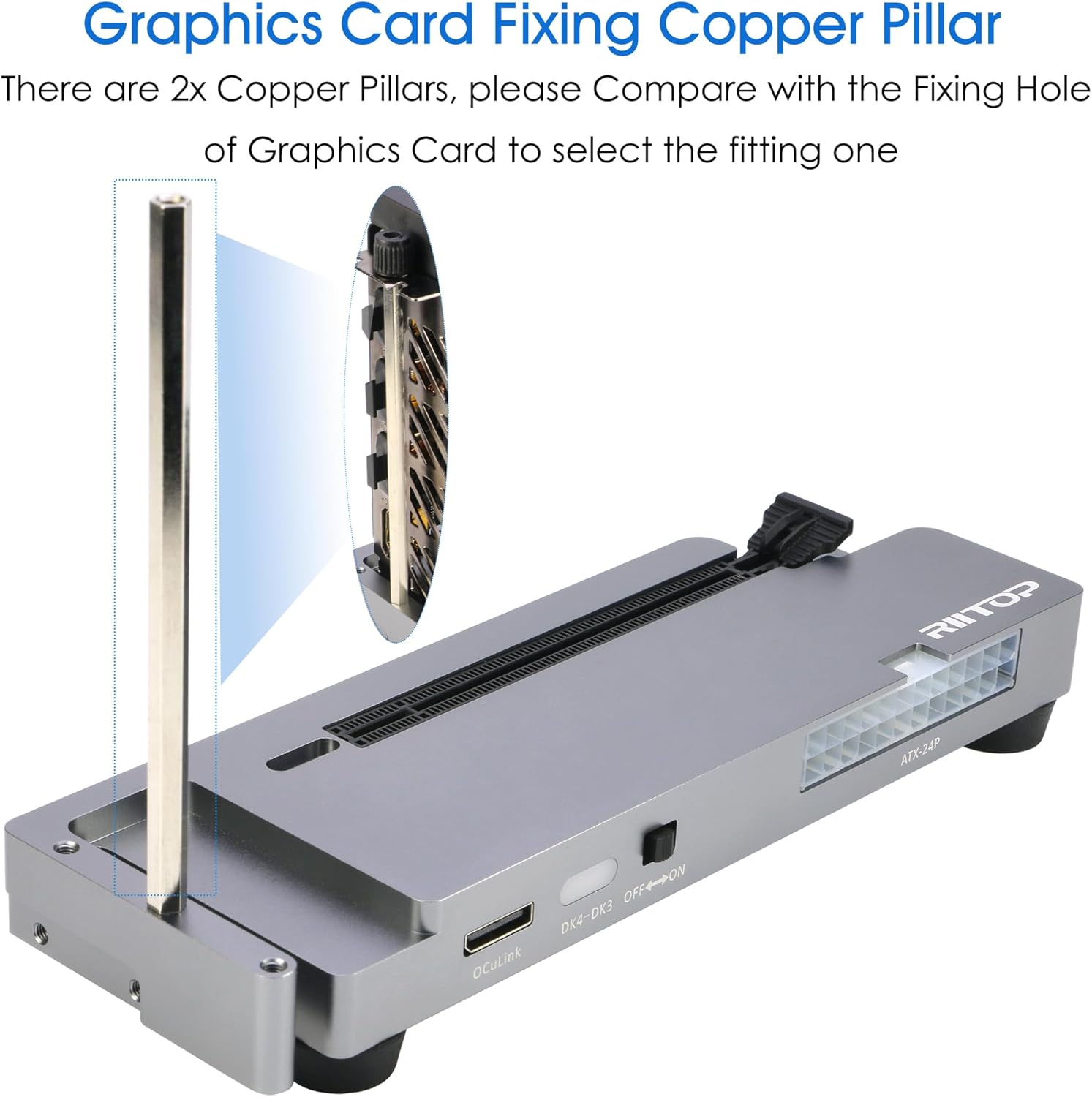 - Packing Including: 1x RIITOP OcuLink GPU Dock (Graphics Card and Power supply not included); 1x OcuLink SF-8611 4i cable; 2x Fixing Cooper Pillar for Graphics; 1x Fixing bracket for power supply; 1 x User Manual; Screws