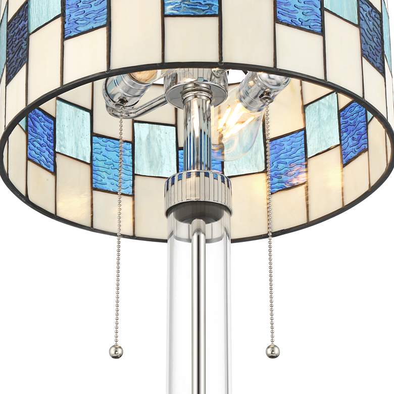 Celebrate the artistry of stained glass with the Robert Louis Tiffany Andra table lamp. Standing 24 1/2" tall, this striking design showcases a hand-crafted art glass drum shade made from over a sixty pieces of colorful glass. The blue and white glass pieces are hand-assembled using the traditional copper foil soldering technique into a geometric pattern. Clear glass column with polished nickel finish base and accents.