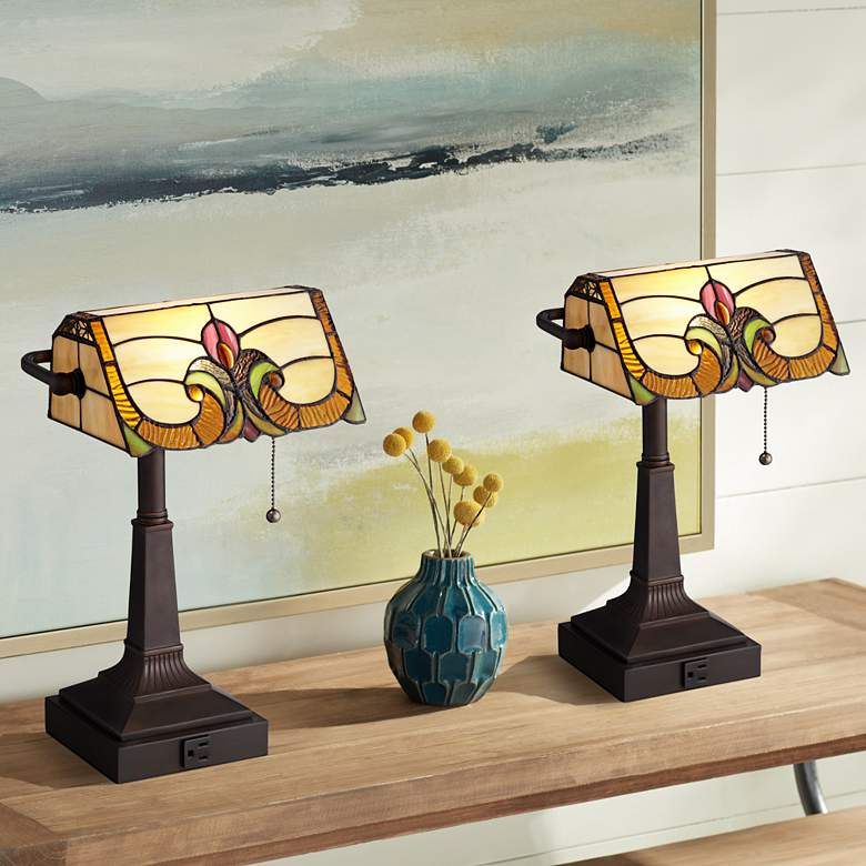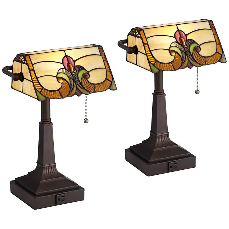 - Set of two traditional bankers desk lamps with built-in power outlet in bases from the Fleura collection by Robert Louis Tiffany.