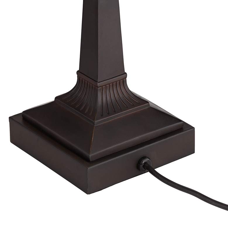 Perfect for a fan of traditional Tiffany-style lighting, this set of two accent desk lamps are a beautiful addition to your table or office space. Each features a bronze finish banker lamp body, with a colorful art glass shade on top that shines light downwards. Turn bulbs on and off with pull chain switches. A power outlet is built into each base, adding a surprising but welcome touch of functionality.