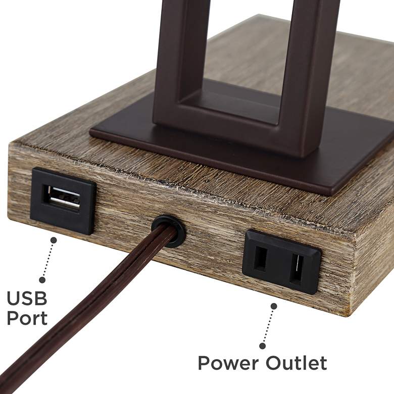 - Lamp base has a built-in USB port and power outlet for easy charging of phones and other devices. Profile was inspired by Mission lamps, ideal for farmhouse or rustic room style.