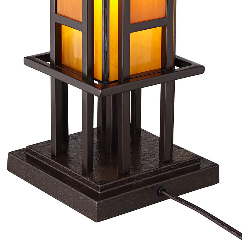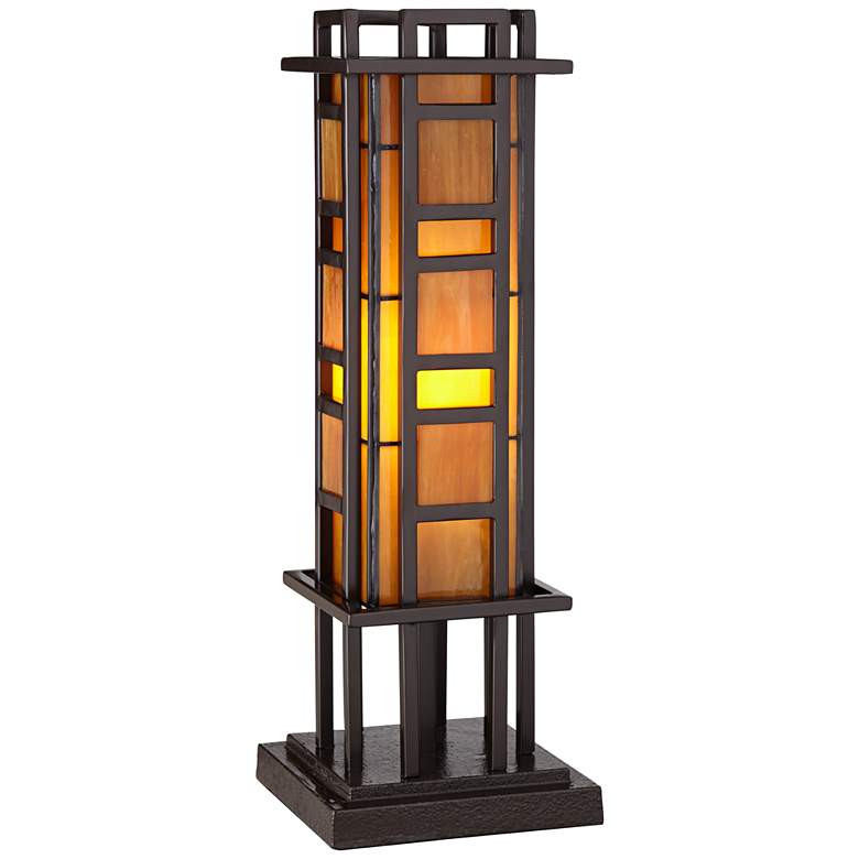 Make any room feel more inviting with the warmth and glow of this charming Arts & Crafts accent table lamp. Its sturdy iron base and perpendicular angles have a bronze finish that frames amber art glass in a variety of hues. On-off switch is a handy in-line switch located on the cord. A wonderful look for a side table, hallway table, or shelf.