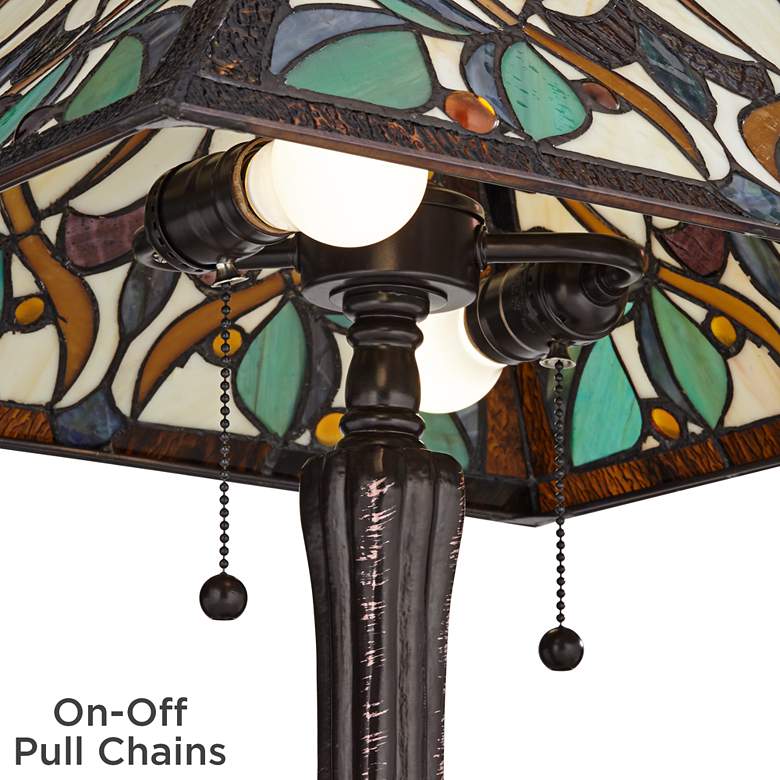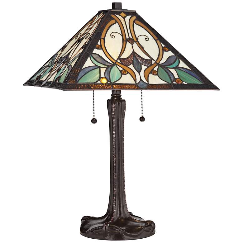 Add this elegant Tiffany-style table lamp to your home decor for a colorful and sophisticated Victorian accent. The floral shade is a lively mix of colorful art glass bordered by textured bronze glass. The decorative base is constructed out of metal, finished in aged bronze. Twin pull chains operate the two lights. From Robert Louis Tiffany, this charming design is one of our best-selling Tiffany-style lamps.