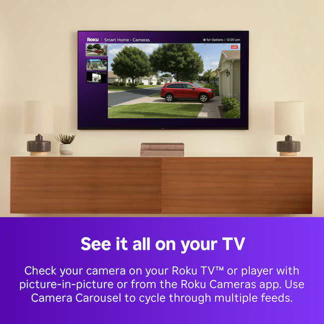 See it all on your TV: Check your camera on your Roku TV™ or player with picture-in-picture or from the Roku® Cameras app; set up multiple cameras using the Camera Carousel to cycle through each feed and pull up a specific camera when motion is detected