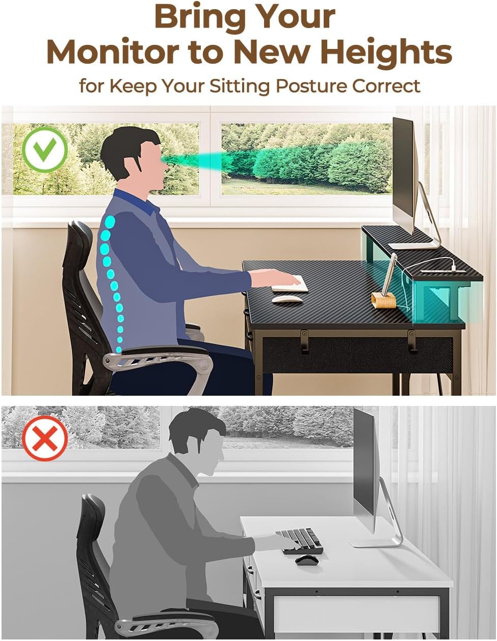 - All-in-one Versatility Computer Desk: The desktop size (39 inch*20 inch) fits your laptop, books and 3 large capacity fabric drawers (each drawer can support up to 8 lb, about 2 laptops). Ample room for all of your office or work- from-home needs. The two lower shelves on the side allows you to organize paperwork and keep your area clutter-free. The monitor stand allows you to sit correctly while working, so that you can have a healthy cervical spine to stay productive while working at home