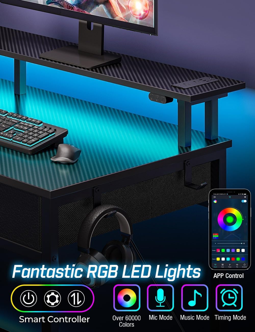 - Gaming Desk with Multifunctional LED: Enjoy the gaming desk with vibrant multi-color RGB LED light strips. 60,000 colors controlled by the Phone App or controller enables you customize brightness, color, mode, and timer settings. The LED lights also sync with music, creating a romantic and energetic atmosphere for gaming