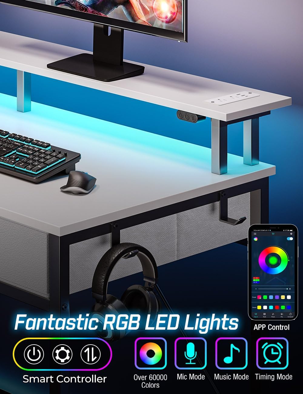 - Gaming Desk with Multifunctional LED: Enjoy the gaming desk with vibrant multi-color RGB LED light strips. 60,000 colors controlled by the Phone App or controller enables you customize brightness, color, mode, and timer settings. The LED lights also sync with music, creating a romantic and energetic atmosphere for gaming