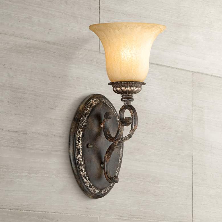 The housing and round backplate of this set of two wall sconces features rich bronze finish while the backplate and shade holder are accented in gold finish. Swirl arm holds a delicately designed scavo glass shade in this charming wall light. From the San Marino collection by John Timberland®.
