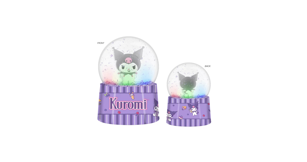 - Kuromi Snow Globe: This snow globe features Kuromi in the center of the dome. Base of the snow globe is purple and decorated with various sweet treats and images of Kuromi. Written across the snow globe base is “Kuromi.”