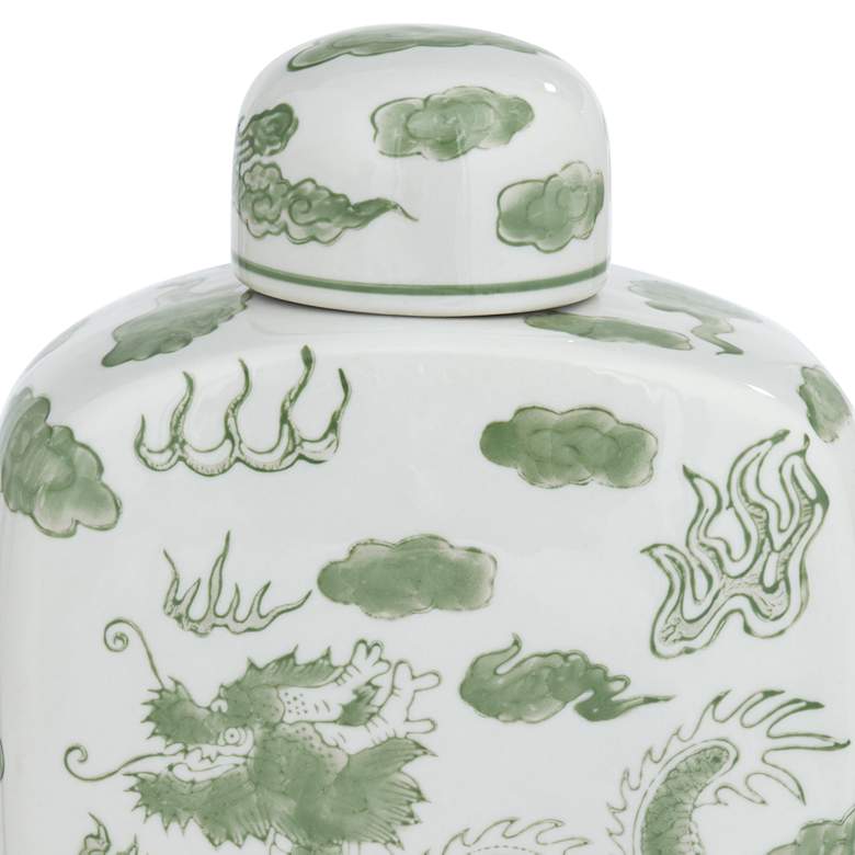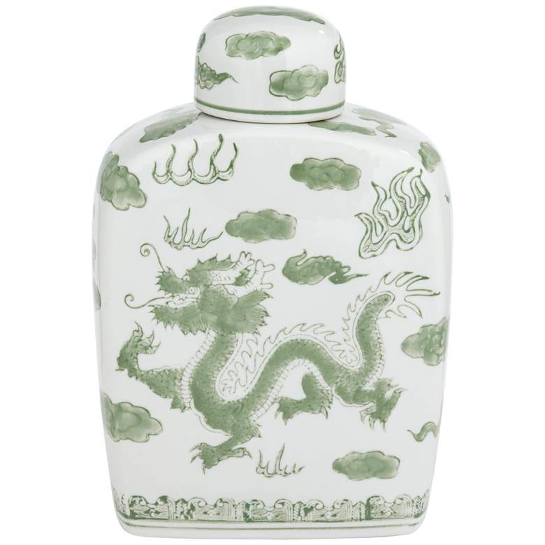 The traditional beauty of Asian decor stands out in this ceramic ginger jar, an exquisite way to boost decorative style in an indoor or outdoor space. White ceramic construction with a glossy finish adds extra elegance, with a bright green Asian-inspired dragon pattern and a romantically shapely silhouette. This lidded jar is perfect as an accent piece, but also is ideal for storage with its food-safe feature.