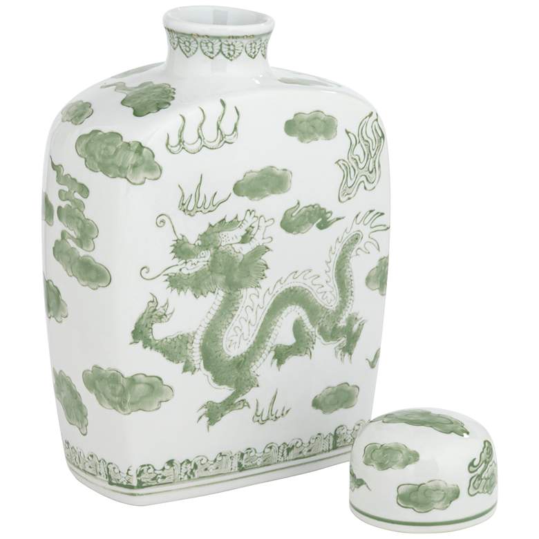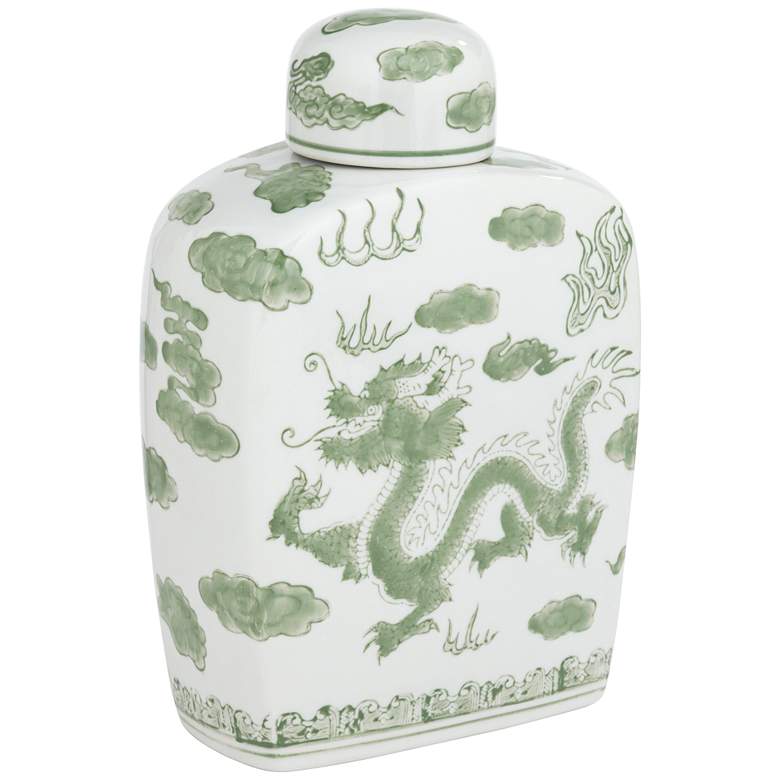 - Hand-painted green dragon pattern with glossy finish. White ceramic construction.