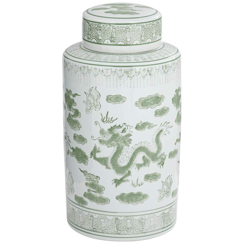 The traditional lore of Asian influence shows up in force to decorate this white and green ceramic ginger jar. This lidded jar sports an attractive cylinder silhouette with a deep lid as an embellishment. Glossy white ceramic features the heritage-inspired Asian dragon pattern, an excellent choice for kitchen counters or display tables. This food-safe jar is suitable for indoor or outdoor use.