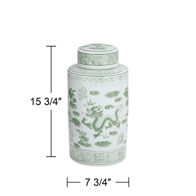 - Hand-painted green dragon pattern with glossy finish. White ceramic construction.
