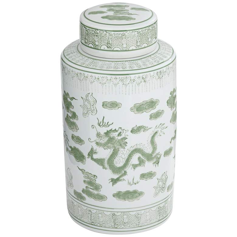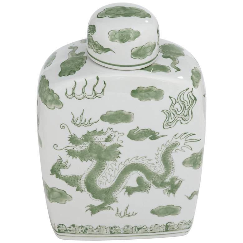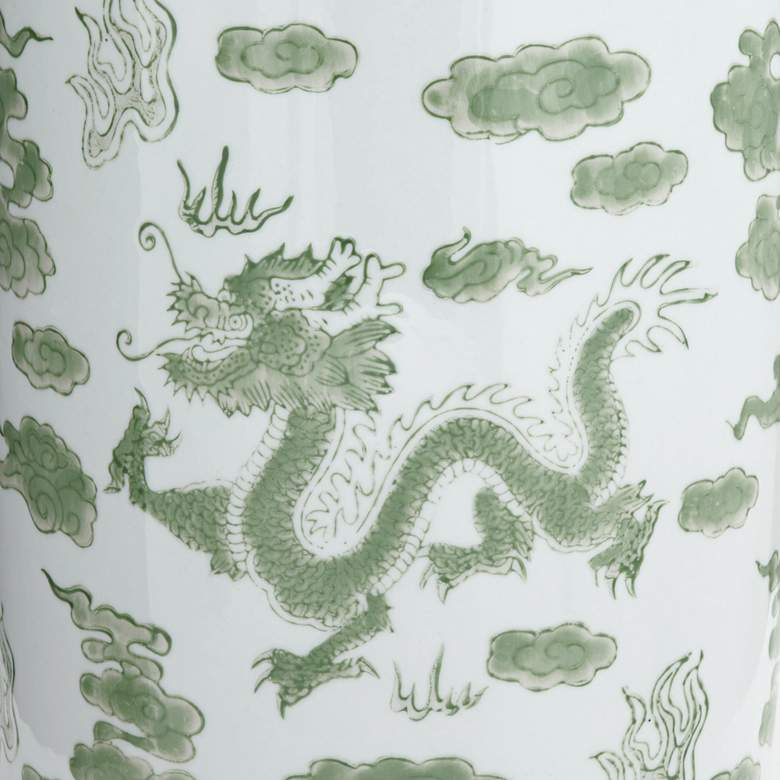 - Hand-painted green dragon pattern with glossy finish. White ceramic construction.