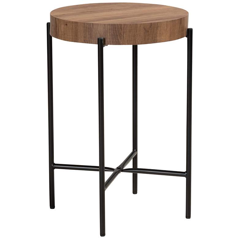 Easy style and mood appeal follows the design of this modern industrial round end table. From Baxton Studio comes a charming end table blending a tall openwork metal frame with a bold black finish and crossed bars at its lower level. Embrace a shapely round natural brown wood top, chunky and stylish, as it reveals natural wood grain markings. This end table is suited to a visible space where its elegance will be appreciated.