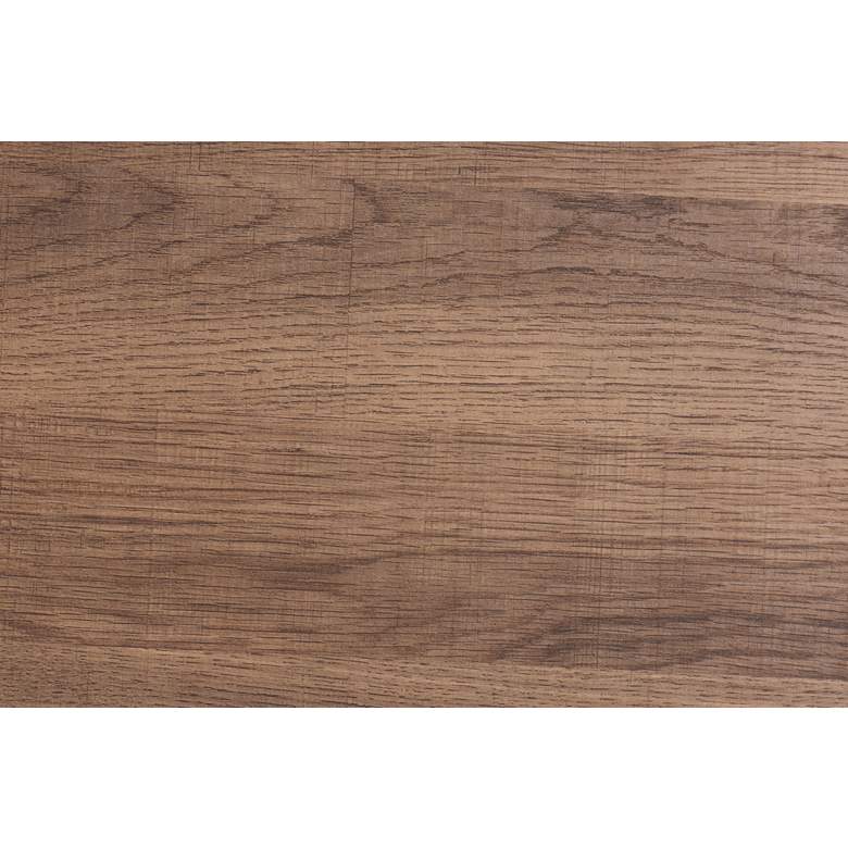 - Walnut brown finish over MDF wood tabletop. Black finish over metal openwork frame. Rounded legs. Crisscross base.