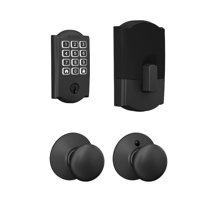 Schlage Arrive Camelot Matte Black Electronic Deadbolt and Plymouth Door Knob Bundle
