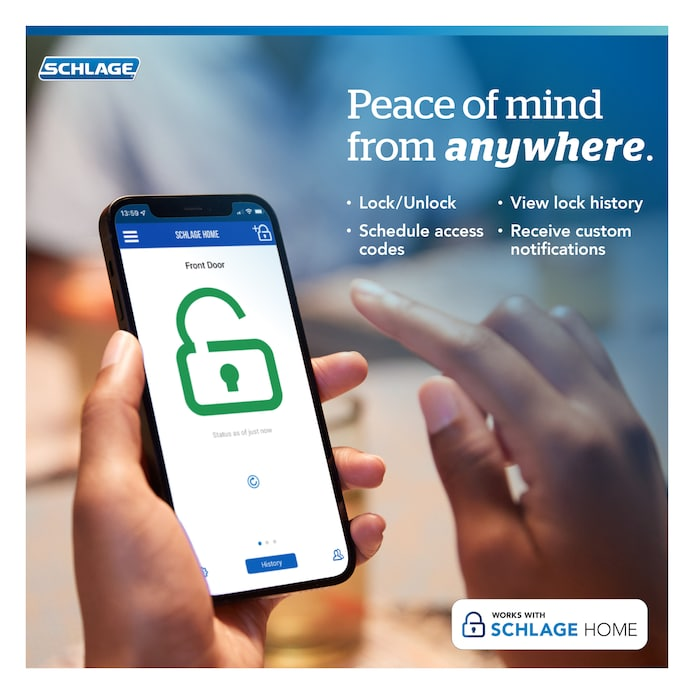 APP MANAGEMENT: Lock and unlock from anywhere, manage up to 250 access codes for keyless entry, view lock history, receive customizable notifications and easily manage multiple locks at once - all when paired to the Schlage Home app and connected to a secure WiFi network