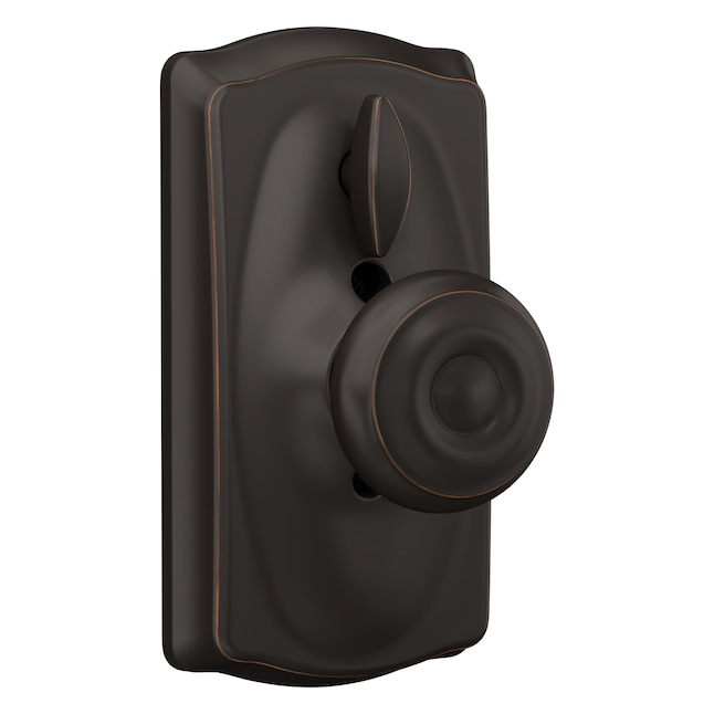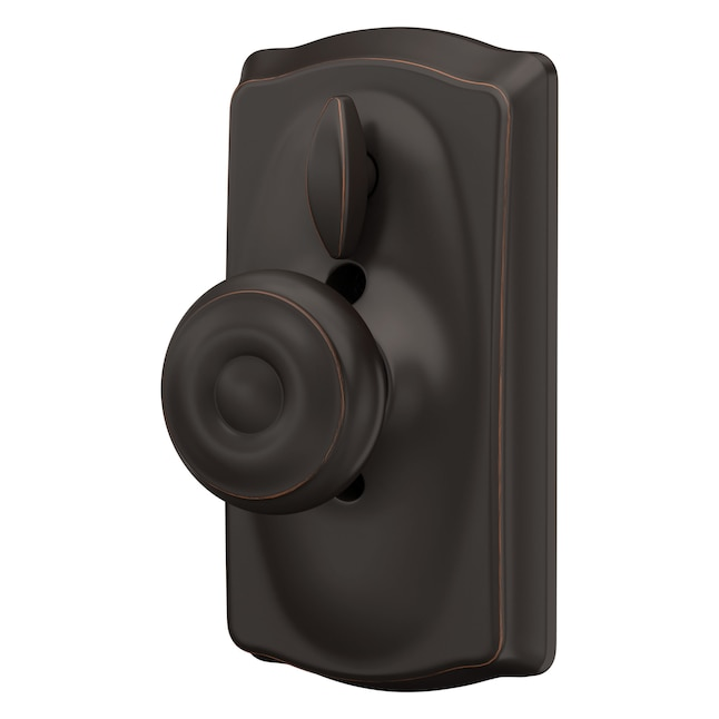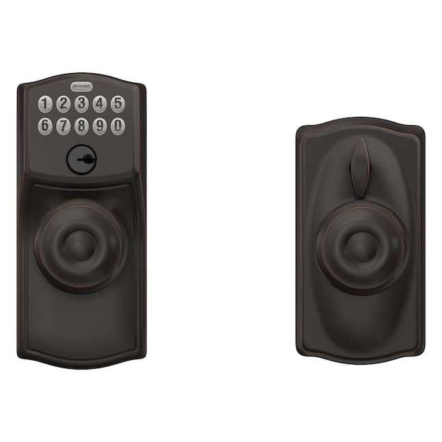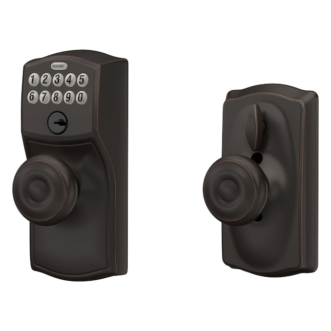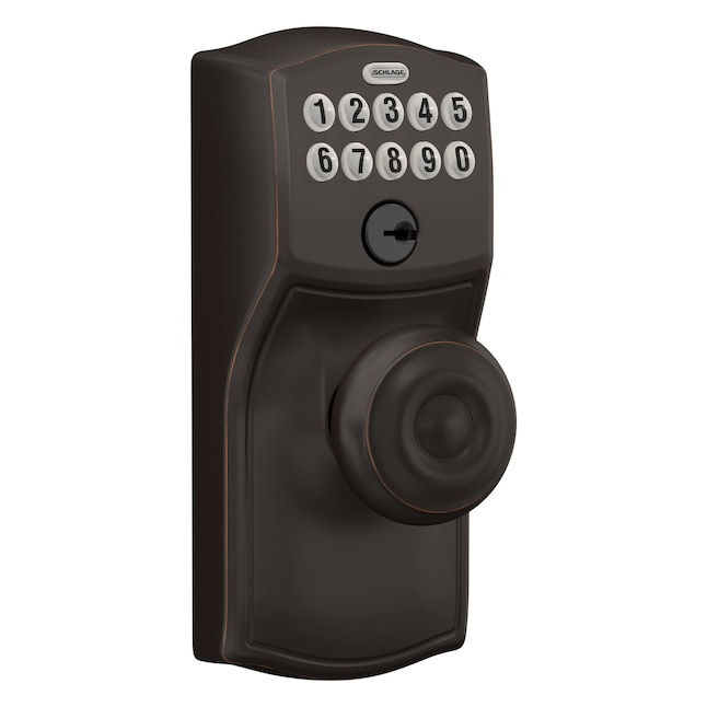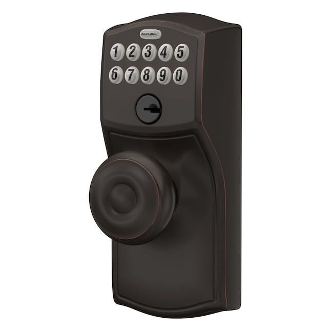 The Schlage Georgian Keypad Knob with Camelot Trim in Aged Bronze is perfect for use on front doors, garage entry doors, and side and back doors. With a keypad knob, you can control entry to your home more easily and securely, and our Flex – Lock feature allows you to set the lock to automatically re – lock after 5 seconds of inactivity. No more hiding keys under the doormat or losing track of copies – just use access codes that can be created or deleted in seconds. The modest Georgian knob features symmetrical detailing throughout, while the Camelot trim’s scalloped architectural details add charm to any home. Our Aged Bronze finish is inspired by traditional design, featuring warm, copper tones that break through its darker, aged exterior. Plus, it’s been designed and tested with strength and durability in mind.