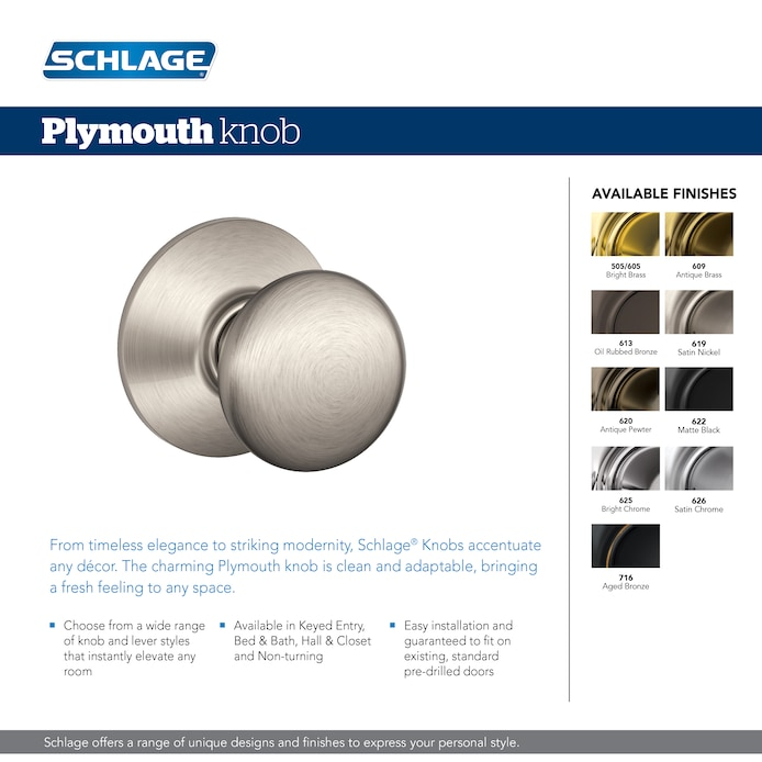 Schlage Encode™ smart Wi-fi deadbolt offers peace of mind from anywhere by allowing you to remotely manage your lock via the Schlage Home app or Key by Amazon app. There's no need to purchase an extra accessory/hub to connect to your lock from anywhere it will connect to your home’s Wi-fi signal similar to your laptop, making it easy and intuitive to use. Graded best in security, durability and finish by industry experts, Schlage Encode™ smart Wi-fi deadbolt offers the advanced features of secure encryption and built-in alarm technology. Combine with Schlage’s Plymouth Keyed Entry Door Knob with self-aligning screw holes for hassle-free installation. Schlage’s premium metal construction and quality craftsmanship provides everyday strength and peace of mind. Great for back or side door use.