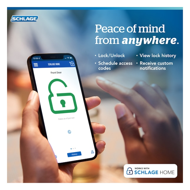 PEACE OF MIND: Lock and unlock from anywhere, manage up to 100 access codes for keyless entry, view lock history, receive customizable notifications and easily manage multiple locks at once - all when paired to the Schlage Home app and connected to a secure WiFi network