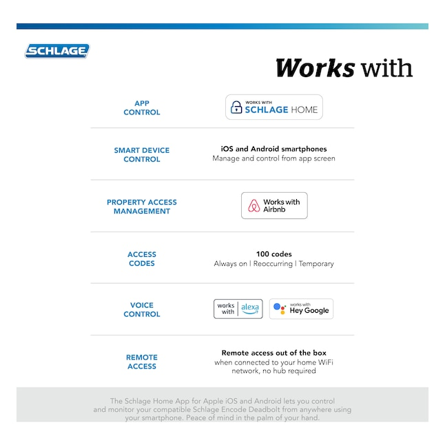 PEACE OF MIND: Lock and unlock from anywhere, manage up to 100 access codes for keyless entry, view lock history, receive customizable notifications and easily manage multiple locks at once - all when paired to the Schlage Home app and connected to a secure WiFi network