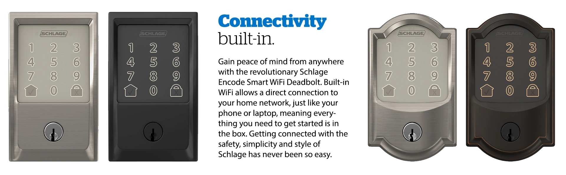 ANYWHERE ACCESS: With built-in WiFi compatibility, you can easily and securely connect your Schlage Encode Deadbolt to your home WiFi network to control and monitor your home from anywhere with the Schlage Home app